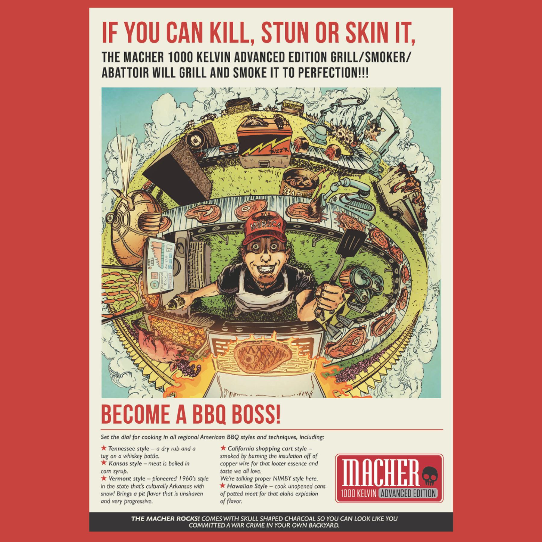 The American Caper team go behind the scenes of the full-page ad for the Macher 1000 Kelvin Advanced Edition grill/smoker/abattoir that appears in Issue #1. Illustrated by Chris Anderson.